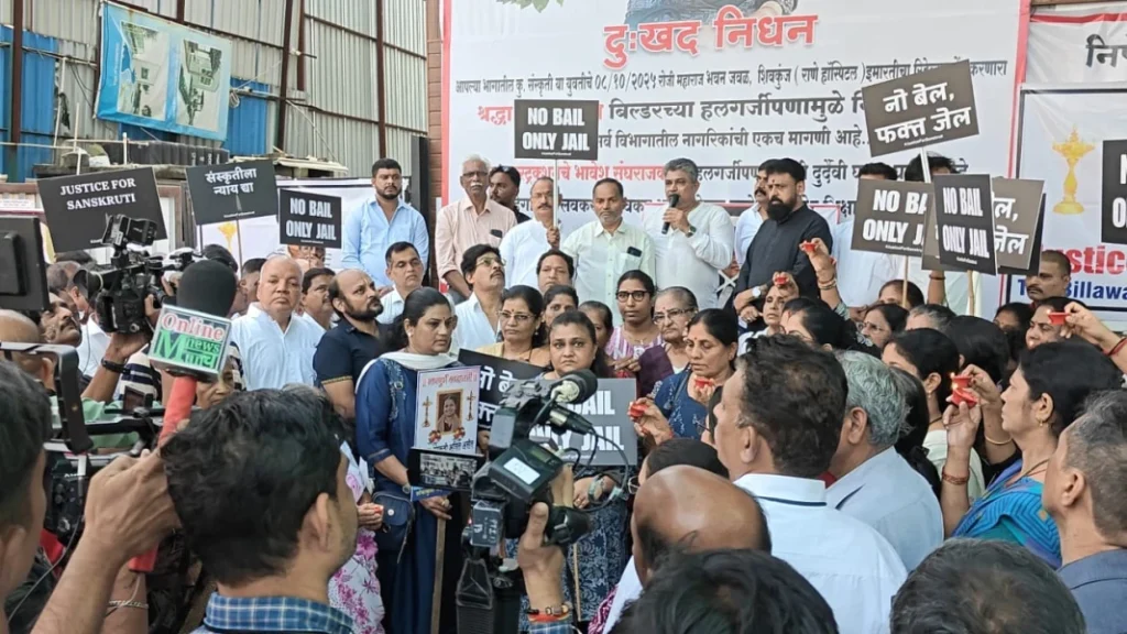 “Justice for Sanskruti”, a movement initiated by The Billawar Association, Mumbai to protest against builders and others for not taking adequate precautions for the safety of people by providing safe and sufficient net cover above the public moving paths and also against BMC officials for not adequately keeping check on the safety measures taken by the builders. In line with this a silent demonstration was organized by the Association on 12/10/2025 at Caves Road, Near Maharaja Bhavan, Majas Wadi, Jogeshwari East.